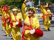 法轮功的精彩表演受到沿途观众的热烈欢迎