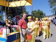 孩子们的热情一点不比大人逊色。两个年约3岁的小女孩跟着学员的功法表演做炼功动作,学得极为准确;一群欢呼雀跃的小朋友对着法轮功队伍用中文说:“谢谢!谢谢!”
