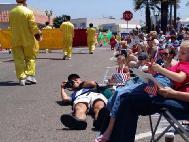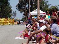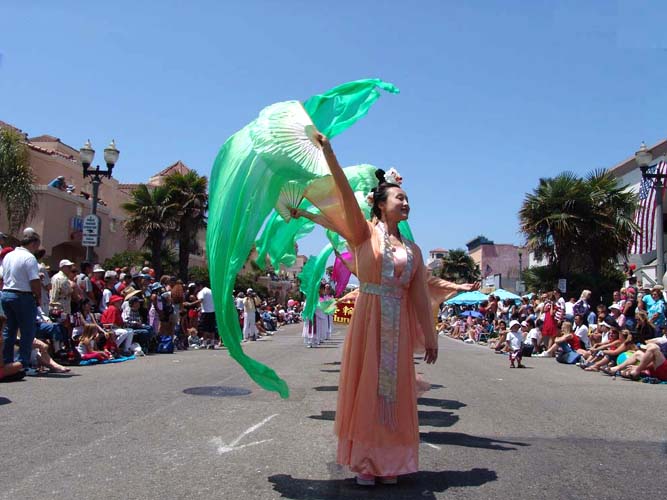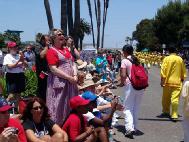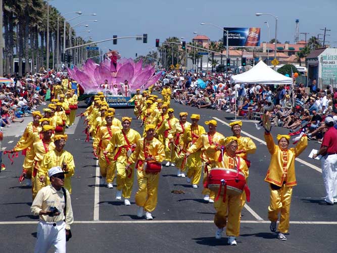 【明慧网2004年7月5日】2004年7月4日美国国庆,南加州美丽的海滨城市杭庭顿滩 (Huntington Beach)举办第100届国庆游行。洛杉矶法轮功学员,以及部分来自圣地牙哥和拉斯维加斯的学员,首次参加了这一美国密西西比河以西规模最大的国庆游行。法轮功学员表演的腰鼓、仙女舞,装饰着巨大莲花的花车,以及花车上的功法表演,受到观众的热烈欢迎,给沿途30万欢腾的民众带来真善忍的美好祝福。