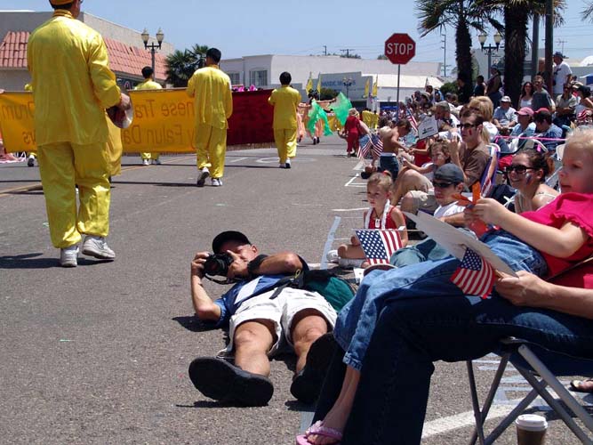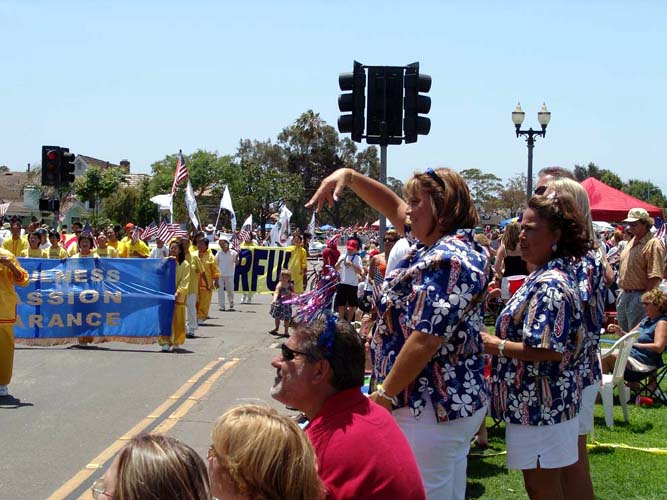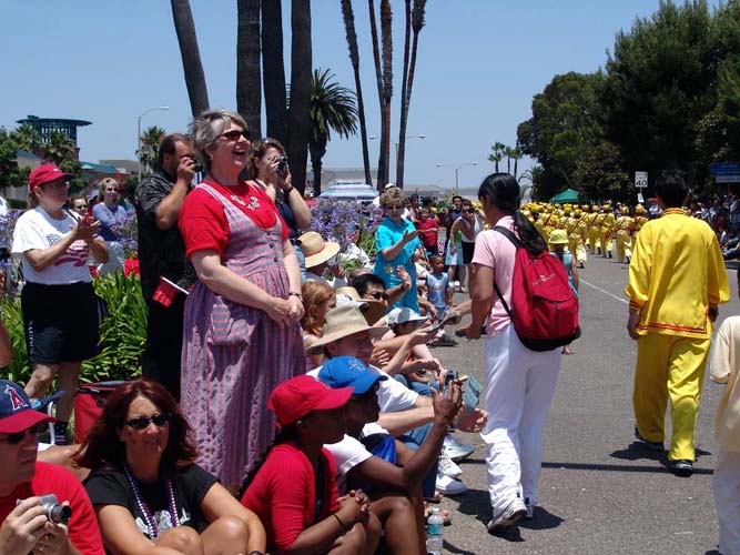 美国人民对法轮功学员与他们共同欢庆节日极为热情,不断为法轮功学员的精彩表演报以热烈的鼓掌欢呼。观众中,有人高喊着刚刚学会的“法轮大法”;有人挥舞着国旗,随着腰鼓队的鼓点手舞足蹈;有人模仿着花车上学员的功法表演,做起了法轮功的动作。人群中不断有人喊着:“太美了!”“真漂亮啊!”一位白人女士兴奋的对着法轮功队伍用中文大喊:“你好!你好!”两位男士乘队伍停下来的机会,站在“法轮大法好”的横幅前留影,并对着横幅鞠躬、作揖;一位维持秩序的警察被优美的功法吸引,找学员询问在哪里可以学功。
