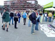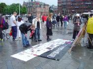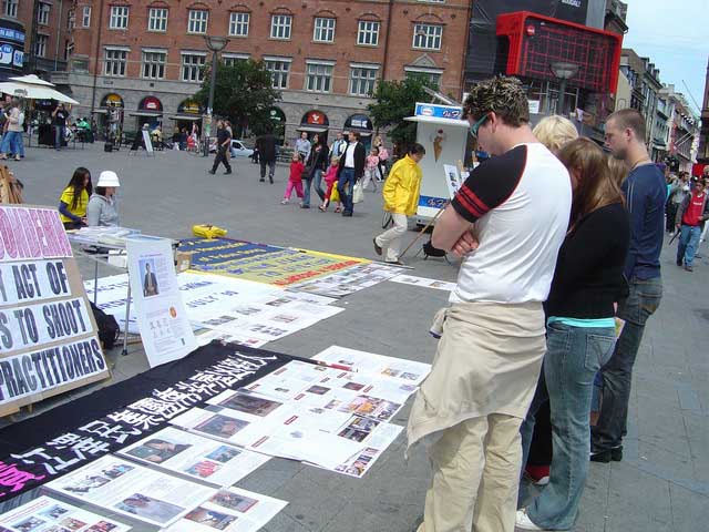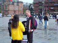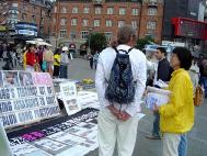 为了让人民尽快的了解发生在南非的枪击事件。下午丹麦和部份瑞典学员又到哥本哈根市中心,市政厅广场,向过往行人讲真相,发放有关枪击事件的传单。过往的行人对这一事件表示了极大的关注,许多人仔细的看展板,倾听学员的介绍,与学员交谈。