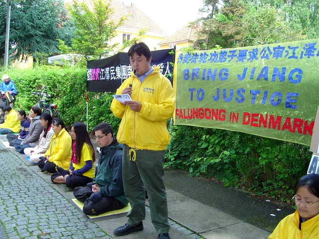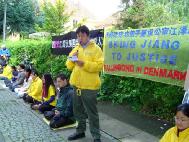 丹麦法轮功发言人马可.徐在中国大使馆前宣读了新闻公告,谴责在南非的凶杀事件,呼吁丹麦政府和人民来关注这一事件以及发生在中国境内及海外的对法轮功的迫害。