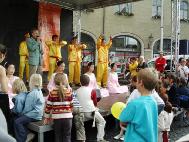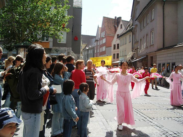 在奥古斯堡著名的市政厅广场上,来自十几个不同团体的展台和多彩的舞蹈、服饰和文化艺术吸引了大量的观众,有不少人围观正在练习中的由法轮功学员组成的腰鼓队,并不时报以热烈的掌声。