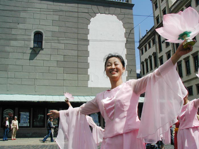 在接下来的环城游行之中,法轮功的队伍十分突出,在法轮大法的横幅后边是一头可爱的狮子,然后是一面大鼓开道,腰鼓队紧紧跟上,仙女和扇子舞随后翩翩而至,所到之处观众不断的报以热情的掌声和叫好声,许多人拍照和摄影。身穿洁白服装的女学员手捧被江氏集团迫害致死的国内学员的照片缓缓而来,男学员手中高举的横幅告诉人们在中国正发生着对法轮功的残酷镇压,呼吁人们给与道义上的支持。许多观众接过了真象资料,他们要了解到底在中国发生了什么事情,江氏集团为什么要对这样一个和平的团体实行镇压。