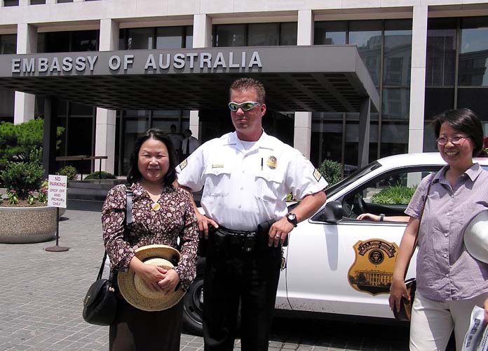 ![]() 法轮功学员在澳洲驻美大使馆前宣读给澳驻美大使的信 | ![]() 法轮功学员和使馆前警察合影 | ![]() 法轮功学员和澳大利亚驻美大使馆官员约翰-斯多克先生合影 |