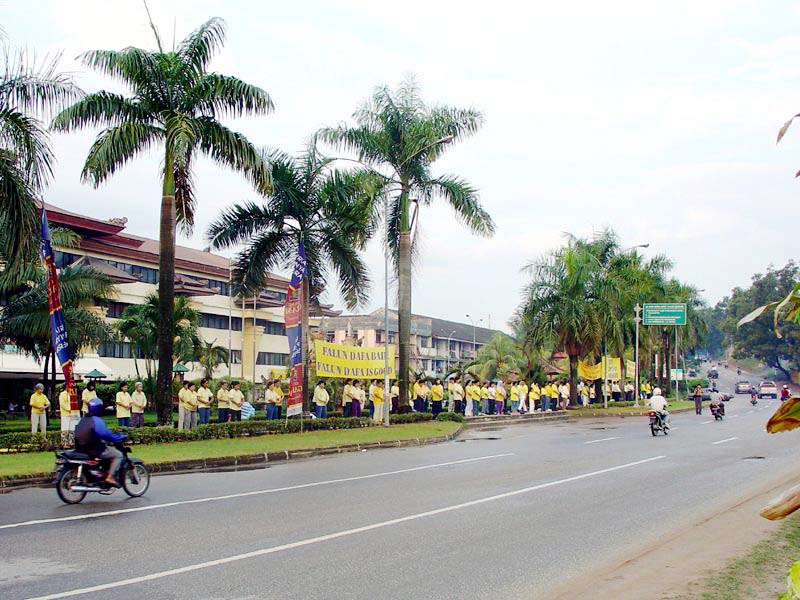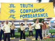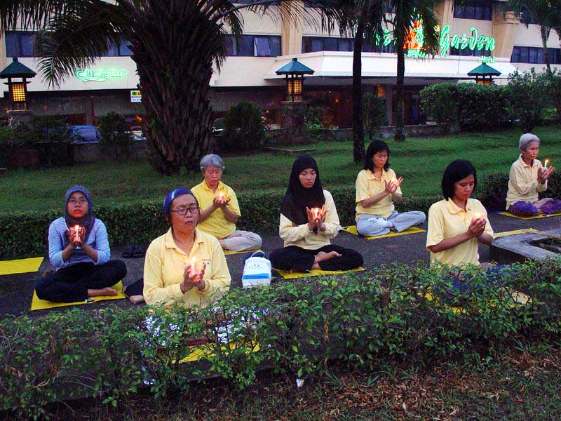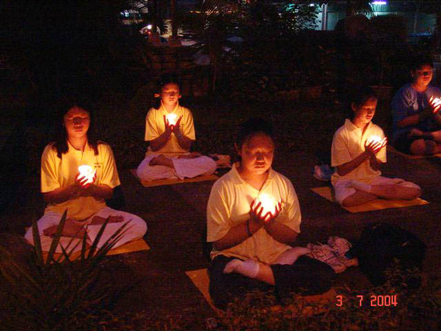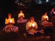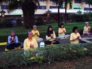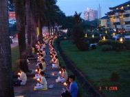 在法会第一天的下午,学员们在所住宾馆前面的人行道上炼功、发正念和举行烛光守夜。来往的车辆和摩托车很多,经过学员们时,很多都摇下车窗或停下来,接受学员送给他们的大法真象资料。晚上学员们進行了大组交流,大家交流了在各自国家和地区向政府、法律界及民众讲清法轮功真象和洪法的体会。