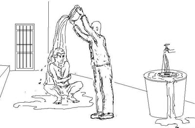 法轮功学员因不放弃自己的信仰在中国大陆的看守所、劳教所等非法关押场所遭受到的常见酷刑之一:浇冰水。