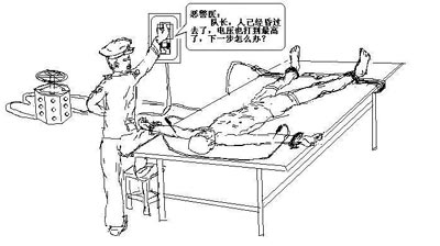 如图所示的是最残忍的电刑之一:叫电针,恶警可以任意调整电流、电压大小,毫无顾忌的迫害受刑者,高电压时,受刑者会被电流击得从床上弹起很高,全身痉挛,大小便失禁。如果受刑者心脏不好的话当场会导致死亡。更有许多处于绝食状态学员也被反复施以这样的迫害以强迫他们放弃绝食抗议。