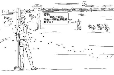 在夏天,尤其是入夜时,恶警们将学员的衣服脱光后,长时间铐在露天处暴露肌肤以利用蚊虫、小咬等肆虐叮咬来折磨学员,有时一连几天,使学员遍体红肿、痛痒不堪,甚至连眼皮都肿得睁不开。