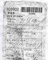 2001年11月,我遗失了护照。于2002年4月17日去领事馆申请补办。当时接待我的是前领事部主任段晓毅,他见我手续齐全就给了我一张取证单,上面写着4月24日取(见照片)。当我按照单子上写的4月24日去取时,正碰上了于洋先生。他瞥了我一眼,阴阳怪气的说:“你好好等着吧,你的材料还在公安局里呢。”言语中掩饰不住幸灾乐祸的表情。我当即找到了经办人段晓毅,他却装作不认识我,一脸诧异的样子说:“什么护照?我不清楚。我没给你办过,这张单子不是我写的。你找给你办的人吧!”