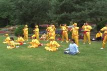 在城里绕了一圈,也看不见街上有几个人,大家心却都不急不躁,车里一片祥和的气氛,突然,见路边正在开一个露天音乐会,很多人围坐在那里,旁边还有不少孩子在等着坐游览马车。大家说就是这里了。停好了车,几位同修商量着,怎么去跟主办者沟通,希望他们能接受我们给他们表演一场。刚商量好,一个主办者匆匆的迎着我们走来,大概是我们一身金黄的打扮吸引了她,她主动走上来问我们要做什么,三两句话,没费一点劲,主办者邀请了我们做十五分钟的表演。