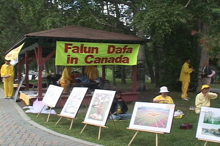 赶到SUDBURY时,头天已经赶过去的两三位同修已经把介绍大法的展台布置得非常美丽了,它坐落在一个景色十分迷人的公园的進口处,周围山清水秀、繁花似锦。看到当地CTV电视台的记者已在那里等候,同修们顾不得欣赏风景,炼功的、发资料的,打鼓的、舞狮子的,十几分钟内就样样就绪了。