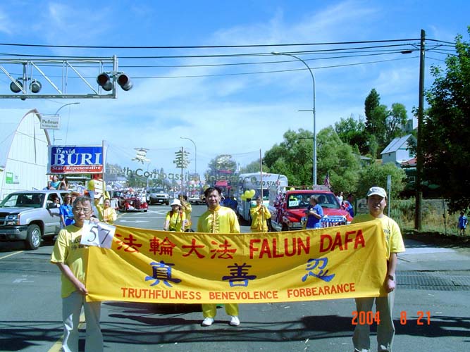 8月21日上午,来自Portland、Spokane、Lewiston、Moscow 和当地的法轮功学员在游行的起点排起了自己的队伍。金黄色的横幅和炼功服、自制的小莲花车以及声音洪亮的法轮大法音乐,始终是周围的人们注意的对象。今年是法轮功学员连续第四年参加“小扁豆节”游行。