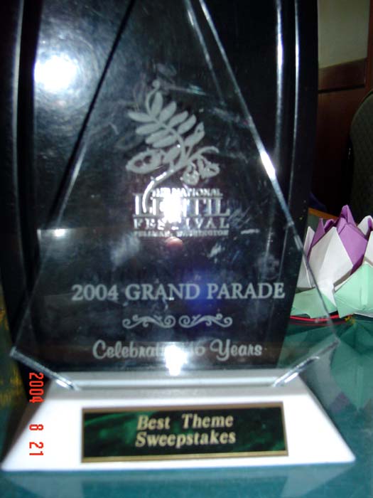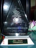 当游行队伍通过主席台时,台上的喇叭大声的播出了对法轮大法的简介。简介播完后不久,就有一个组织者从台上下来,把一件奖品送到打横幅的学员手里。那是一件带蚀刻花样的有机玻璃板的奖品,底座上印着“最佳主题奖”(BEST THEME SWEEPSTAKES ) 的字样。他们把本次游行中唯一的“最佳主题奖” 给了法轮功学员,并且是冲着游行简介中“真、善、忍”的主题来的。那是对“真、善、忍”的褒扬,是对法轮大法的褒扬,也是法轮大法在深入人心的一个明证!