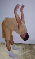此种迫害发生在沈阳张士教养院和龙山教养院等地,是教养院常见的迫害手段。动作是弯腰低头向下倒控,两腿分开,双臂向后上扬。
