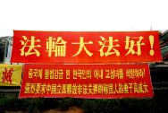 次(27)日,法轮功学员早早的赶来,分布在宾馆的所有出口和几个主要的路口,当贾的车队路过时,学员们纷纷迅速打开了早已经准备好的横幅。晚上,前来请愿的人数已达近百人,活动持续到晚上9点多方才结束。