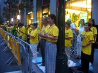 值得一提的是,纽约向来是美国防范恐怖活动的重点城市,尤其在共和党大会即将召开的前夕,纽约警察高度紧张,可谓是草木皆兵。然而在法轮功学员的活动现场,几乎难以看到有警察在徘徊。法轮功团体向来以和平理性,遵守法规,体谅他人而闻名,所以警察毫不担心。比如今夜,数百人聚集在这里,呼唤着民众的认知与支持,但是行人往来依旧通畅无阻,曼哈顿的夜依旧宁静,只是于这宁静之中,平添了一种令人感动的庄严。