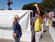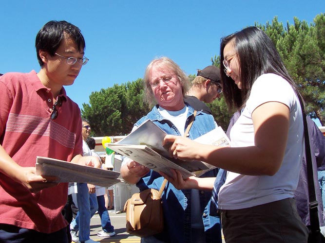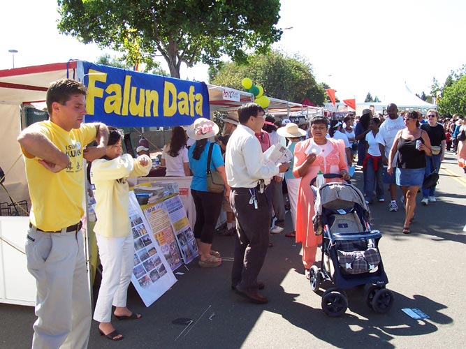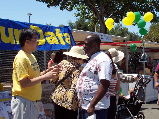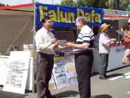 星期天一早,学员们还在示范功法,就有一位男士来到我们的展位,他说他把我们给他的资料从头到尾看了一遍,他今天特地赶来,希望得到资料里提到的《转法轮》一书。学员告诉他可以在书店里买到,或是在网上免费下载,他了解后高兴的离去。