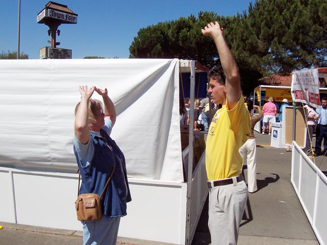 一位女士问了许多关于法轮功的问题后,对法轮功的强身健体的效果很感兴趣。这位女士说她没有电脑看有功法示范的光碟,也无法在网上下载教动作的书籍。于是一位西方学员主动在现场教她功法。