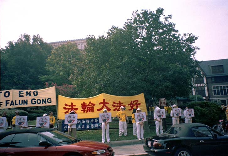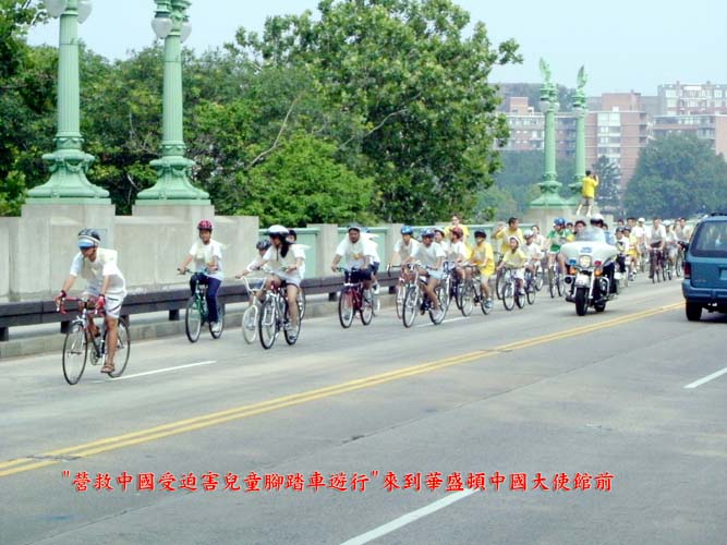 中国驻美大使馆是到华盛顿DC的法轮功学员经常去的地方,那里每天都有学员风雨无阻的在和平抗议,要求江氏集团停止迫害法轮功。2004年7月23日上午,部分台湾学员抵达中使馆前和平请愿,迎接“营救中国受迫害儿童青少年单车之旅”的车队,他们有的远从加拿大骑到华盛顿DC,精神可嘉。多位参与的孩子在记者会上发表演说,谴责江氏集团迫害法轮功修炼者并要求停止利用教育系统毒害中国青少年使其反对法轮功。