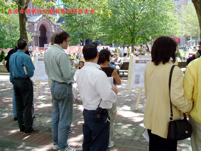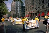 华盛顿DC法会后,7月25日,学员又来到波士顿参加洪法讲真象活动。波士顿举办的游行队伍十分壮观。游行中有悼念在大陆被迫害致死的法轮功学员,接着是反酷刑展示车,气氛庄严肃穆,还有很多横幅;还有介绍大法洪传世界的内容。很多游客拍照留念,目不转睛久久不愿离去,有老外对我们竖起大拇指,有的对我们合十表示恭敬。