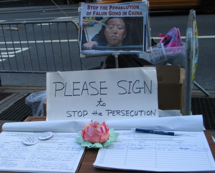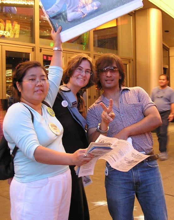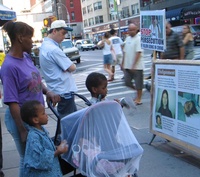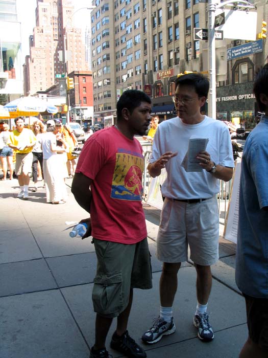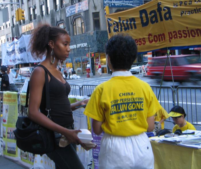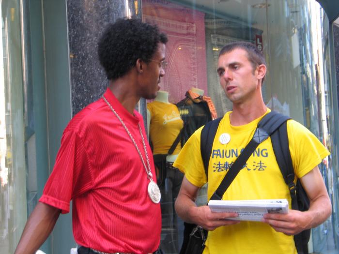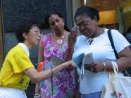 很多西方人,虽然有心了解,但突然看到反酷刑展,或者拿到传单时,往往无法一下子就把我们所给的信息构成一幅完成的、容易理解的图画,因此当面讲非常重要,而且几分钟就能讲出大法的基本正面信息。比如我们可以简单的介绍说,法轮功是一种类似太极、瑜伽的修炼方法(很多纽约人喜欢打坐,但也有很多西方人对打坐炼功还很陌生),92年首次在中国传出,因为对人身心的显著效益,七年就有上亿中国人学炼(关于“法轮功是什么”的正面信息)。99年一个心胸狭窄、嫉妒心非常强的独裁者(江泽民)突然命令取缔,并密令“三个月消灭法轮功”(谁、为什么、什么时候开始了镇压,还可以适当结合6.4以及当时把学生描述成无赖和暴徒的抹黑手法提到对我们的全面谎言无限与仇恨宣传),不惜一切手段(至少数十种酷刑和许多精神折磨手段)强迫所有学员放弃并反过来咒骂法轮功(对人民的残害)。现在全世界至少五十几个国家都有人炼,只有在中国不让炼,而且五年来真正知道真象的人非常有限,我们希望更多人知道,更多人站出来帮助我们制止这场迫害。