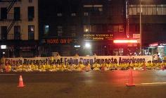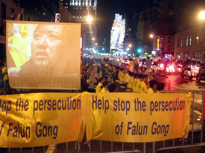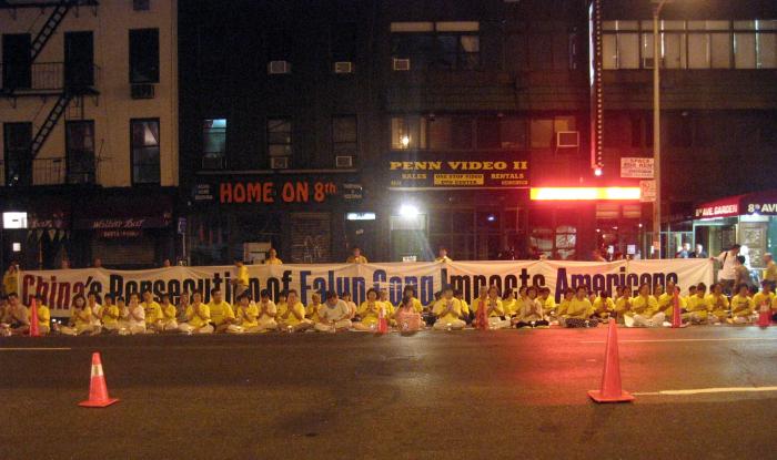 5年来江氏集团的血腥迫害并没有使法轮功销声匿迹,相反,越发衬托出学员在正法中稳步的走向成熟,更加理智,慈悲和智慧。8大道30街的大投影播放着“法轮功真实的故事”,扩音器向世人讲述着法轮功创始人李洪志先生的伟大,法轮功祛病健身的奇效,迫害的由来及残酷以及大法弟子面对迫害展示的大善大忍的慈悲和勇气。解说员的声音穿过夜色,直达人的心灵深处,不少行人驻足观看,索取真象资料。这一切对所有经过的行人,警察和车辆来说都必然是令人感动而难忘的。