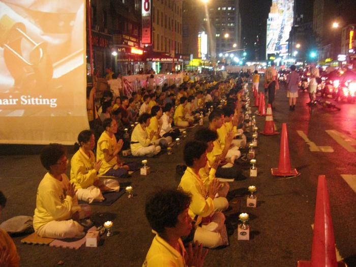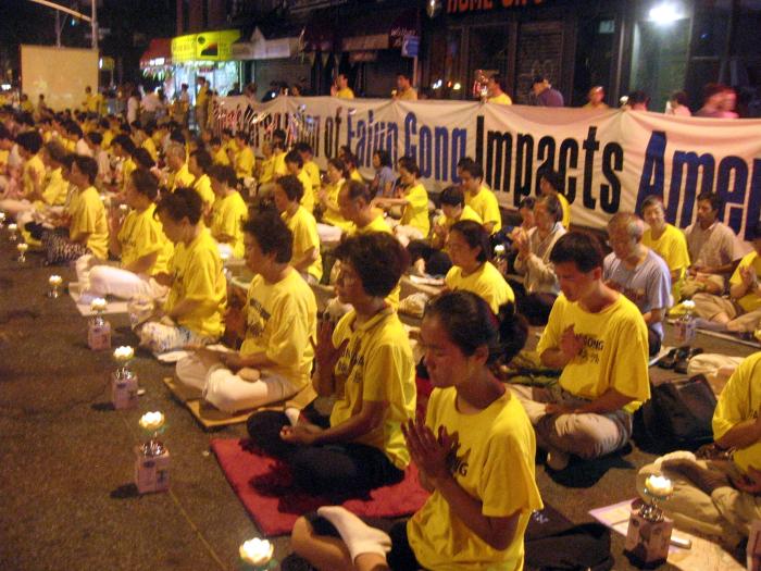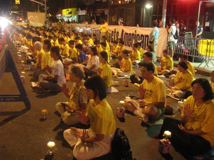 白天曼哈顿街头巷尾到处都是法轮功学员和平的炼功,发真象资料,向关注的行人讲真象。晚上,点点烛光透过夜色,向世人传达着明确的信息:这场对“真善忍”信仰的迫害是对整个人类的迫害,必须立即停止。每个人都有责任站出来帮助停止这场灭绝人性的迫害。