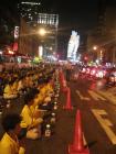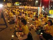 总共约千名学员参加了烛光守夜,千盏烛光于夜色中遥相呼应,气势庄严肃穆而又不乏温馨。学员们大都衣着黄色T恤,整齐的排列着,或炼功,或发正念,一切显得是如此的平和而坚定。