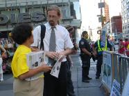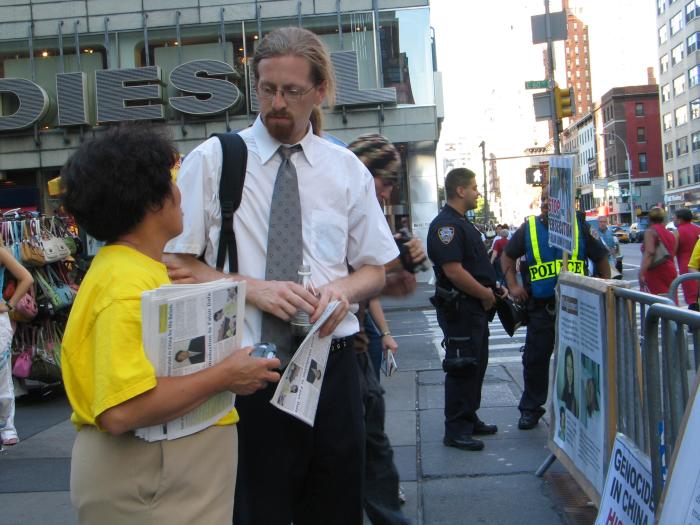 我们为什么要到纽约来呢?就是说,纽约呢,它这个,在世界上来说,它也是一个很大的一个中心城市,那么纽约人呢,他当然对世界的影响也是很大的。我们觉得就很有必要让纽约人能够明白这件事情,究竟在中国发生的什么。很多人,他们看了我们的这个flyer[传单]以后,很吃惊,他第一天拿了之后,看了,第二天见到我们的时候,他会来说:“我看了以后我才知道,这些东西是现在正在发生的呀!”就是说他们本来是不知道的,我们要是不告诉他们他们就不知道。我们能够告诉他们,能够让他们心里明白的话呢,我们当然也希望更多的人能够来支持我们,那么这场迫害呢也能够早一天结束。