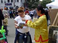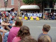 中午过后,艺术表演者逐步登场,每当表演者一到,观众就里三层外三层的围成一圈一圈,聚精会神的观看表演。因为有好几场演出就在我们的展位旁,甚至把我们都包围了進去,为了不影响市民们欣赏艺术表演,我们把位置后撤,并关小音量,依然静静的在炼功……而演出一结束,大家又继续给观众发传单讲真象。我们的表现,不仅给市民们留下了很好的印象,也得到了组委会的赞许。艺术节执行主席索尼亚-索耶女士在一天的活动结束后,表示了对我们的感谢,说:“谢谢你们,你们的表现很好。”