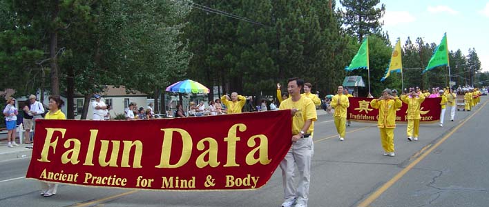 星期日(2004年8月1日)上午,天气晴朗,天高云净,部分洛杉矶法轮功学员经过两个小时的车程,越过重重山道,来到大熊湖畔。这是我们首次参加这里的社区游行。我们的队列有功法演示、唐装舞蹈队以及腰鼓队。排在游行队伍的最前面的是“Hello Big Bear”的问候横幅,接下来是“Falan Dafa” ,“真、善、忍”的大横幅。