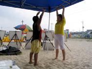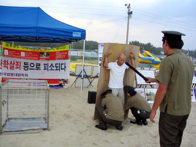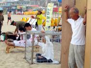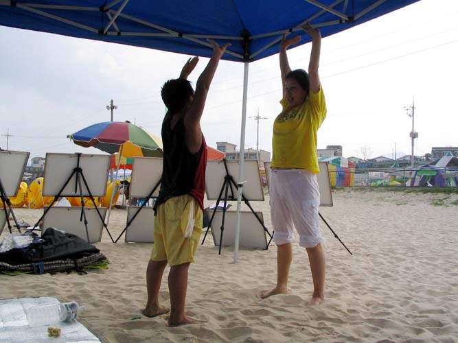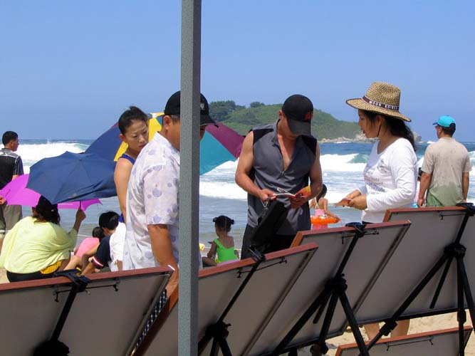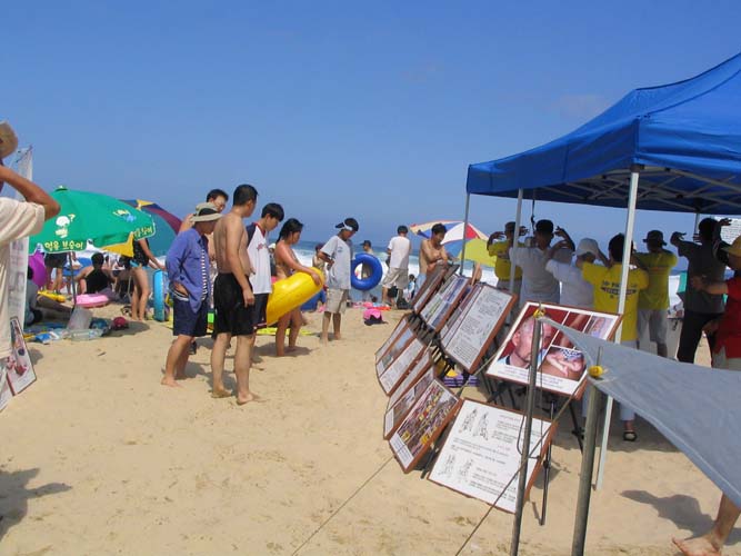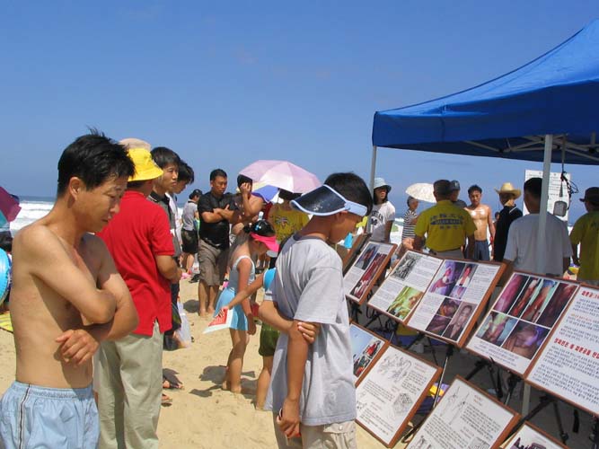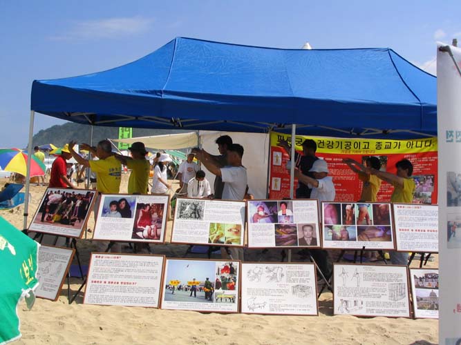 8月4日,他们已经到达束草市落山海上浴场,这是东海岸线最大的旅游点之一。连日来,学员们每到一处,当向有关部门讲清法轮功真象并申请活动场地时,各有关部门明白了真象并听说是为了人权问题,都是热情相待,并积极帮助安排活动场地。