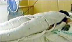 他身上烧的挺厉害,有的地方褪掉一层死皮,露出新的肉皮,手上烧的象带戴套一样。特别是后背烧的更重,烧伤处涂着药,结了大面积的痂了,有的痂与痂之间还往出流血水。