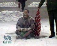 ![]() 王进东稳稳的坐着,大声喊清楚,表明身份后才能盖上毯子。(注意:王进东两腿之间盛汽油的绿色塑料瓶在“大火”之后竟然完好无损?!) |