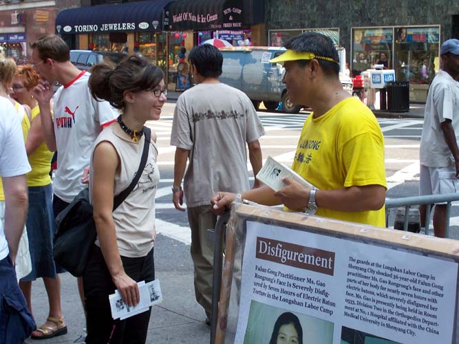 自八月以来,在曼哈顿商业中心的大街小巷,常常能看到身穿黄色T恤衫的法轮功学员,有的演示功法、有的向路人讲法轮功的真象,有的散发真象材料。在人流密集的地方还可看到他们在做酷刑展和图片展。有很多路人会停下来观看和了解真象。有越来越多的纽约人了解了法轮功的真象。