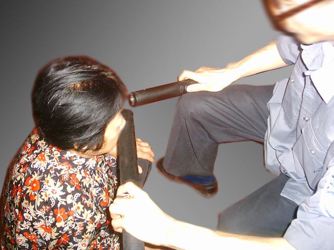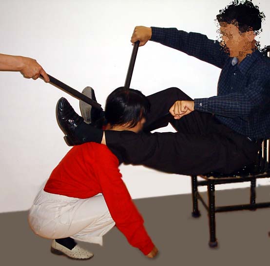 ![]() 壁虎爬墙 | ![]() 男队长坐在椅子上用穿着皮鞋的脚底蹭女法轮功学员的脸和嘴,还把两腿搭在她们的肩上夹住头往前拽,進行人格侮辱,用电棍电击脸、手。 | ![]() 队长电击炼功的学员,每个人至少被两根电棍电,有的是三根,还有用四根的,专往头、脸、嘴上电。 |