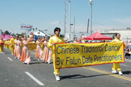 法轮功学员制作的高雅的花车、优美的功法表演、传统的中国舞蹈以及雄壮的腰鼓,受到了沿途观众的热烈欢迎。
