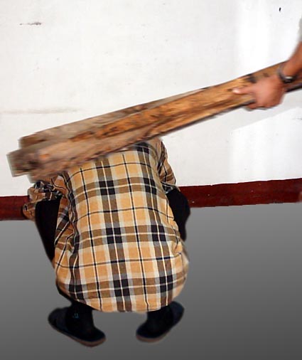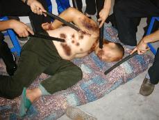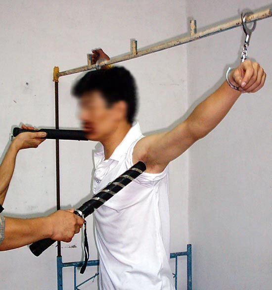 2002年12月末,张士“小楼”3楼9房,在主管迫害的院长程殿坤、恶警史凤友的指使下,4、5名恶人将刘宪勇(男,28岁,法库学员)的两腿按住,强行做“反盘”打坐姿势,并用绳子捆紧。又把他两臂猛背过去,用绳子绑住双手,另一端吊在床栏上,拉至极限,嘴里堵上抹布并用胶带封紧,防止喊叫。这样每次3小时,每天4、5次,折磨数日,刘宪勇本就瘦弱,常常胃痛,加之在普教四大队4个多月的高强度奴役劳动(糊梳子盒、插皮子)身体更显单薄,时间长了,手被勒得不过血,双腿剧痛,以至后来两脚肿胀无知觉,无法独立行走,上厕所需人搀扶。