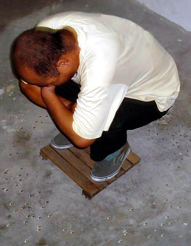 2002年2月的一个晚上,法轮功学员张国义和闫宏伟被带到5房,24小时不让睡觉,四五个打手逼张国义蹲在限定的一块方砖内,蹲不住就会挨“刨跟儿”--用鞋的跟部刨磕后背。其中一人又在张国义的臀部后面的地上摆了一层图钉,蹲不住就会挨扎,为防止他前倾,又在他前身的地上摆了一层图钉,剩下的散落在周围,成宿这么蹲着。后来蹲得腿没了知觉,两只脚肿得鞋都穿不上。