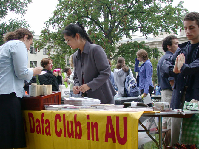 很多学生不但询问法轮功学员们在中国受残酷迫害的情况,更有众多的学生留下姓名与联系方式要学炼法轮功。其中一位关于义务为老年人服务的学生俱乐部的女生特意来到我们的展位,邀请我们为老年人表演功法并教功,并希望越快越好。在我们活动结束的时刻,一位女学生匆匆地直奔我们的展位,希望学炼法轮功。 看着一张张迫不及待要学功的学生脸,我们真心的为他们能在这关键的历史时刻作出珍贵的生命选择而喜悦。