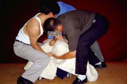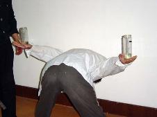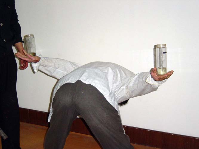 身体弯曲九十度撅着,双手后背平伸,掌上各置一盛满水的水杯。身体如稍不平衡或晃动使水洒出杯子,便毒打。