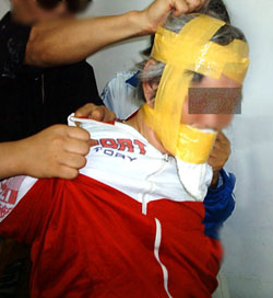 图2-1:10多个恶人把法轮功学员谢秀兰和石胜英等几名学员的嘴用破抹布堵住,缠上胶带。