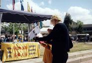 上午9时学员们就把信息台布置好了,首先开始炼功。不一会儿,当地舞台节目主持人用麦克风告诉大家:“法轮大法的信息台就那边,你们到那里签字去吧。”许多人过来看展板,有的人提出问题,学员都一一解答。当他们了解到法轮功在中国无端遭受残酷迫害的真象后就主动拿笔签名支持法轮功学员和平反迫害。
