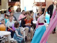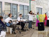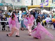 于是,法轮功学员们精心装扮一番,为当地人带来了唐装表演,仙女舞蹈,吉他、小提琴合奏和演唱,小弟子们也跳起了星星舞。两位装扮成仙女的学员在舞台上打着“真善忍”的横幅作为背景,舒缓的音乐和表演与周围的喧闹形成鲜明的对比,仿佛一股清流,吸引着人们近前观看。发资料、征签的学员在旁边向观众解释,这是法轮功学员表演的节目。穿插在文艺表演之间,学员们表演了5套功法,并在台上通过麦克风介绍了法轮大法。
