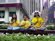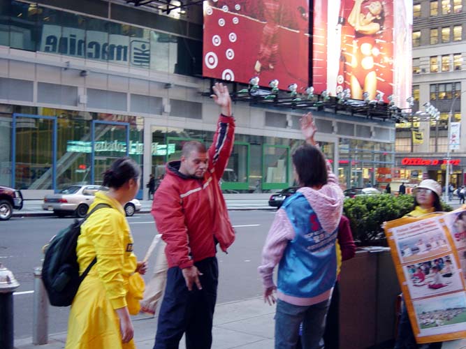 一天的活动快要结束时,在台湾弟子坚守的42街和第七大道上,来了一位有趣的人。他的名字叫比利。他是来学功的。他说两周前他从洛杉矶大法弟子的手中接了一张真象传单。然后他就自己学功。他也没有上网去找消息,他只是按着真象传单上的动作比划。他只会两个动作,那就是两个握球拧掌的动作。就从这两个动作中,他已经感觉到很强的能量流了。所以,他炼习这两个动作已经炼习了两周了。