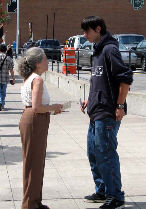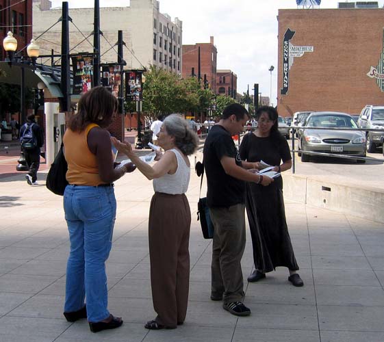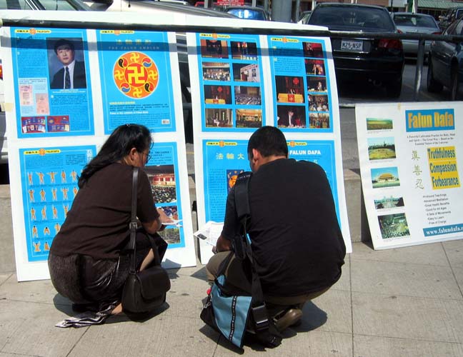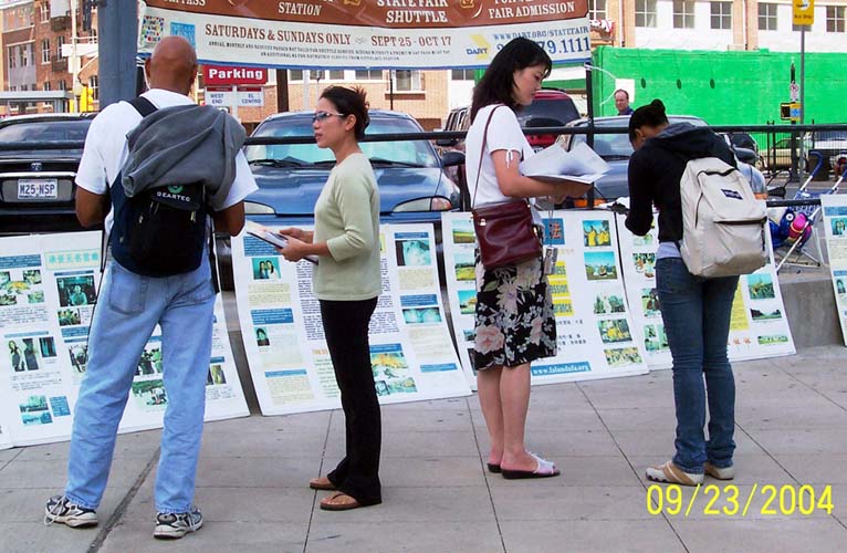 许多人是头一次听说法轮功和法轮功在中国被江××迫害的事情,学员就耐心的给他们讲什么是法轮功,和在中国正在发生的迫害。