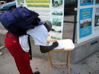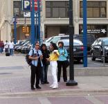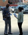 就象每次的活动一样,学员都会遇到有缘要学功的人。一位妇女在教功图片前自己就照着比划起来。一位男士说早就听说过法轮功,就是没时间学,几天在这里把学员们摆的图片一张一张的看,一位学员在旁边为其解释,他说有时间要去炼功点学功。另外一位年轻的黑人小伙子当场就叫学员教他炼功。