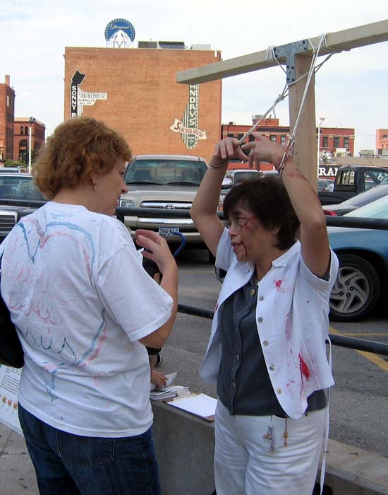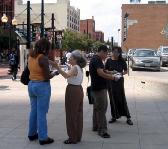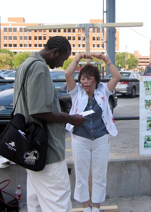 经常看到人们停在演被迫害的学员面前去问问题、关心学员,学员告诉他们:这就是正在中国大陆发生的事情,情况比我们能演示出来的要糟得多,许多善良的人们就是因为按“真、善、忍”去做一个好人而被折磨迫害致死。希望大家帮助停止这场迫害。