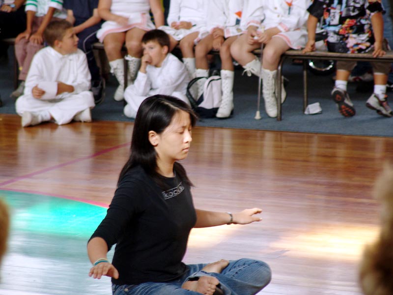 第二天,法轮功学员在大厅中央做了十几分钟的功法表演。